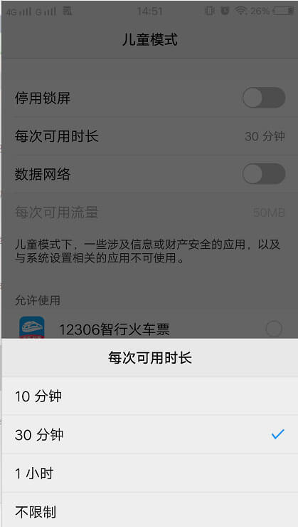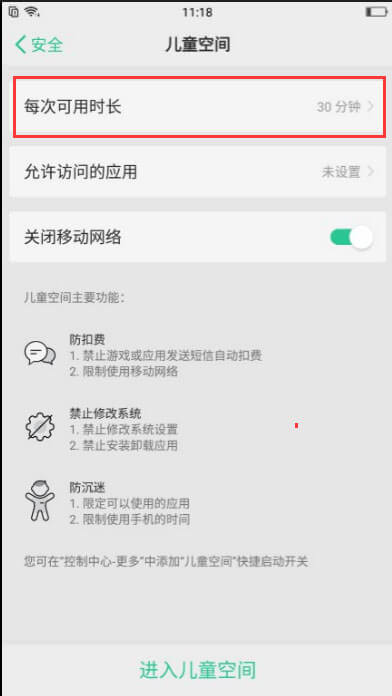 第2步:可以通过设置“每次可用时长”来限定使用手机的时间,防止小孩子沉迷手机。