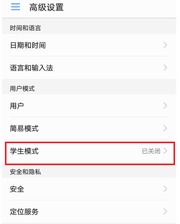 第3步:点击进去之后,下拉找到学生模式,可以看到默认是关闭的,如下图所示: