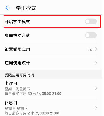 第4步:点击进去,选择开启学生模式,这里我们可以看到可以设置手机使用时间,禁止使用哪些应用和网页记录等,如下图所示: