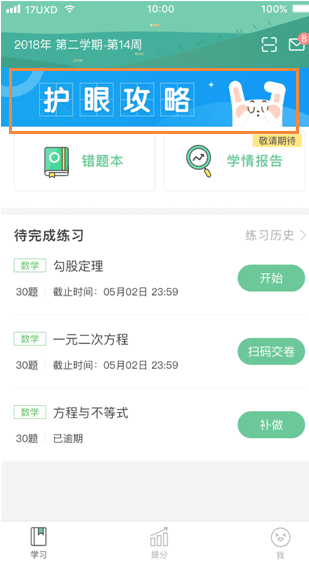 老师布置的线上作业一般20分钟内即可完成,同时您可以打开“护眼提示”,每使用20分钟,产品会提示学生需要休息,保护孩子视力。