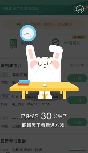 根据学习时长弹出护眼提示,提醒学生休息。持续学习时长超过20分钟,即触发护眼提示,此后每10分钟出现一次,且护眼提示停顿随使用时长而增加。使用一小时后,强制学生休息。